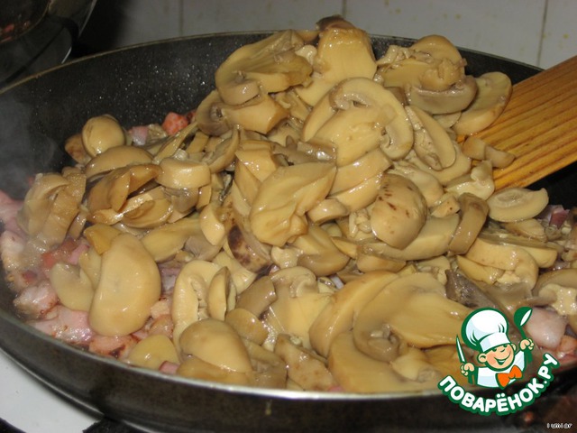 В бекон добавляем грибы (предварительно слив воду).