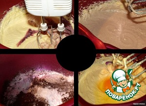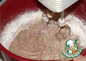 Муку с добавками добавить в масляно-яичную массу, взбить (миксер на средней скорости),
