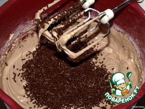в конце взбивания добавить тертый шоколад или, как у меня, готовые шоколадные палочки. Все перемешать,