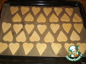 Затем тесто раскатать в пласт толщиной 0,5 см, вырезать формочкой сердечки, выложить на пекарскую бумагу и в духовку при 180 градусах на 10-15 минут