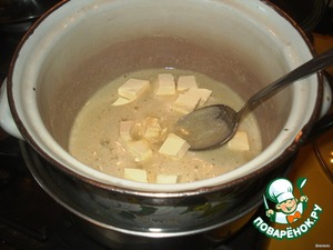 добавить гашеную соду, масло кусочками и поставить на водяную баню до растворения масла и сахара. -