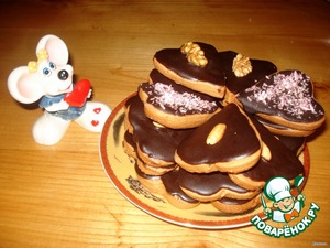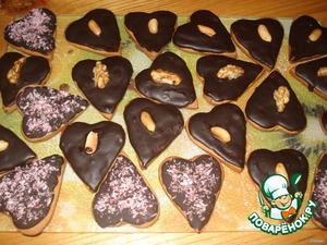 Растапливаем шоколад с добавлением сливок и намазываем на каждое сердечко, украшаем орешками и прочими вкусностями.