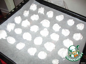 Противень застилаем пекарской бумагой и формируем сами безе. к сожалению, у меня нет кондитерского мешка и я формировала при помощи двух чайных ложек. по размеру безе могут быть абсолютно любыми. выпекаем при температуре 150-170 градусов около часа. после того как как безе будет готово, дайте ему остыть вместе с духовкой.