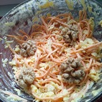 добавить измельченные грецкие орехи (примерно столько же, сколько и сыра, по объему), посолить, поперчить, заправить майонезом.