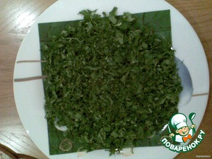 Зелень помыть и нарезать (так как у меня не нашлось листьев салата, я их заменила укропом с петрушкой. Но лучше делать всё-таки с листьями салата, получится намного нежнее)