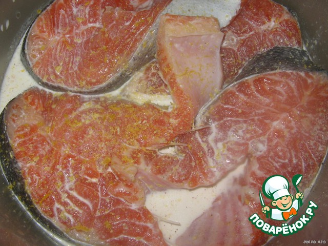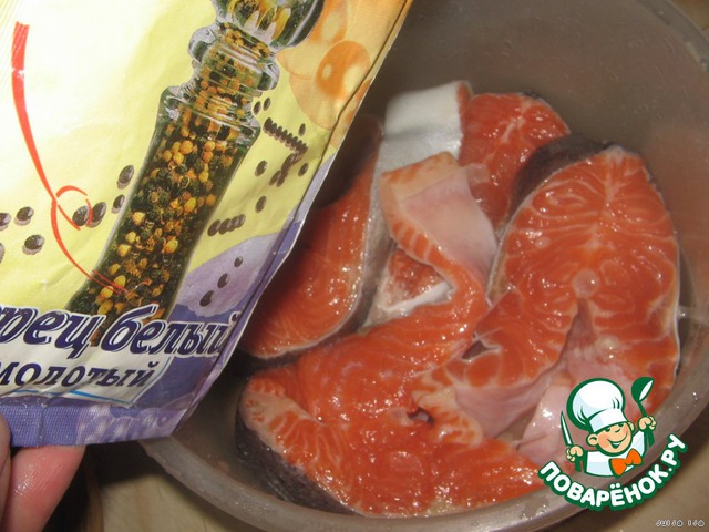 Стэйки обработать. Если нужно почистить (я никак не могу найти у нас в продаже чищеные стэйки. Очень удобно покупать уже нарезанную рыбу, но вот чистить её потом - ужас!!! Рыбку посолить и поперчить.