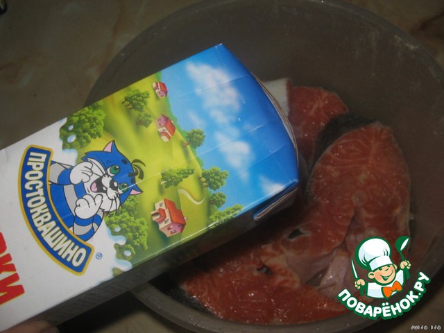 Через час выложить рыбку на противень, вылить сливки. -