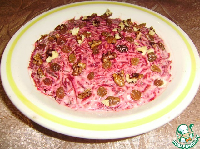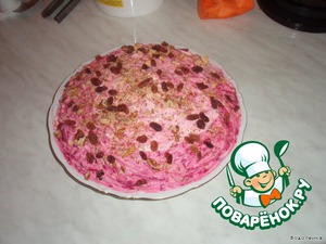 Слой буряка обильно смазать майонезом и притрусить изюмом и измельченными орехами.