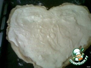 разложить внахлест на противне, выстланном бумагой для запекания.раскатать по размеру противня, придав форму сердца.Наколоть тесто вилкой, выпекать 10 мин при 200гр.