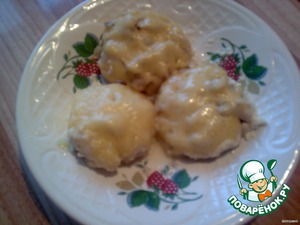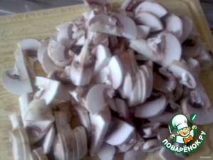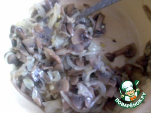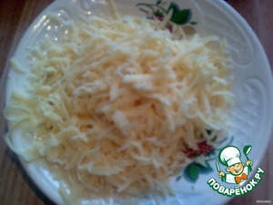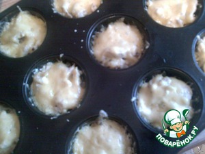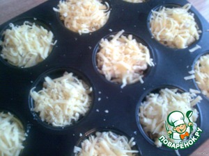 В форму для маффинов насыпать часть тертого сыра, сверху грибы с луком, на них обжаренную грудку и все это засыпать сыром.