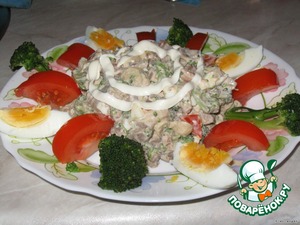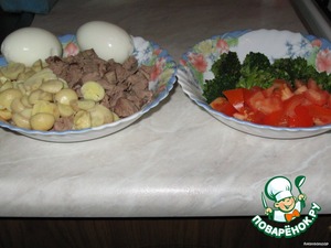 Сварить печень, яйца, брокколи и нарезать. А также маринованные грибы и помидоры.