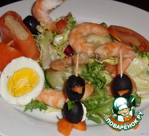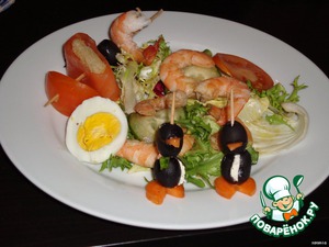 Теперь выкладываем салат на тарелки...сверху креветки...дольки огурца...яиц...помидора...))Нарядную нашими ручками сделанную шпажку...и маслинами...))))Из маслин я сделала Пингвинов...)))Деткам на радость..Идея не моя..подсмотрела...))))Как их сделать покажу отдельно)))