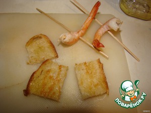 Для этого...пожарьте кусочек хлеба....на растительном масле...Можно натереть его чесноком...Порежте на небольшие квадратики..И обмотаем полоской копченой или соленой красной рыбы...(Можно Сыром...втчиной...зеленым луком....на ваш вкус...Нанизываем на шпажку одну креветку..наш мини бутерброд...оливку..или помидор Черри...(Не было черри...порезала обычный)))