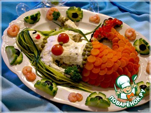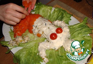 а потом выкладывается в форме фигурки русалочки. Сначала выложили на салат, но в процессе поняли, что без него будет лучше. Салат убрали...