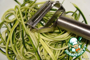 Для волос цуккини режем полосками, солим + несколько капель лимонного сока, все перемешать. минут через 10 сливаем образовавшийся сок, он нам не нужен,