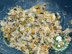 Все это перемешивается с 2 ст.л. сметаны и 1 ст.л. майонеза, солью и перцем по вкусу и лимонной кислотой,