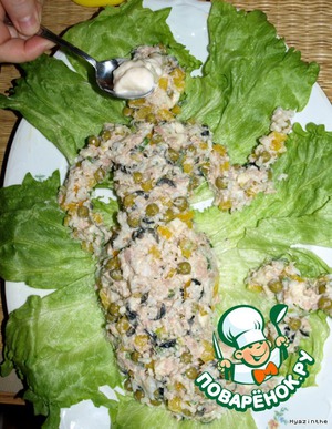зеленого лука, горошка,тунца (консервы без масла) и оливок.