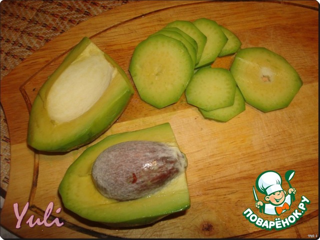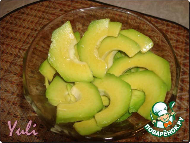 Мякоть нарежьте тонкими ломтиками и сбрызните лимонным соком.