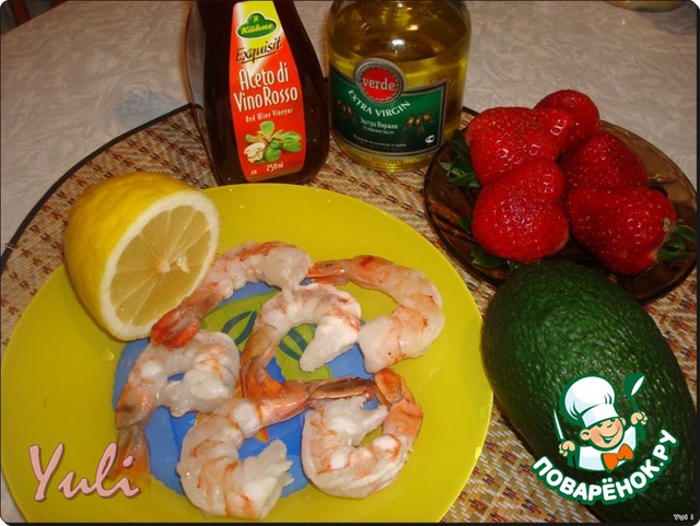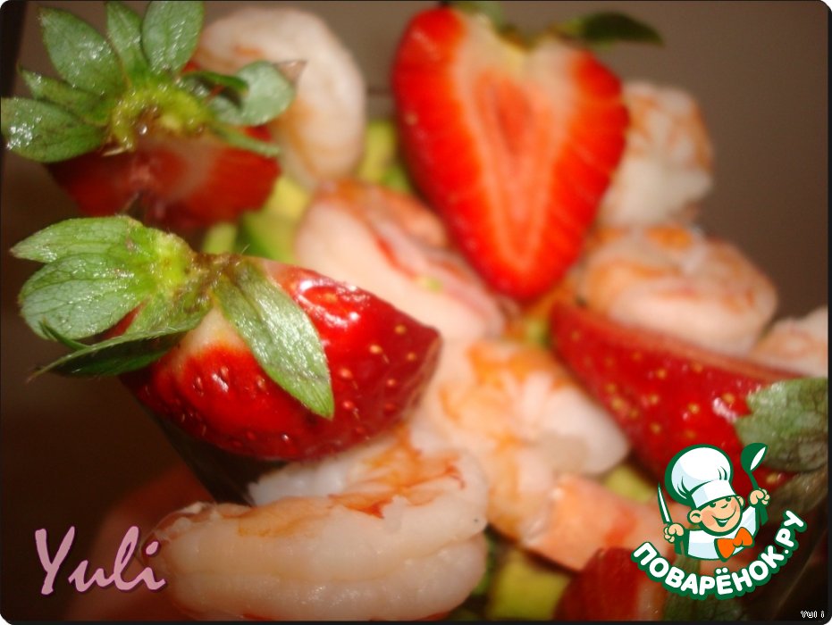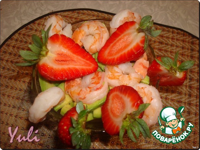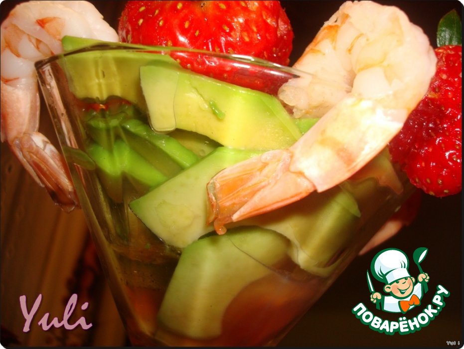 Клубнику и авокадо вместе с креветками разложите в вазочки.