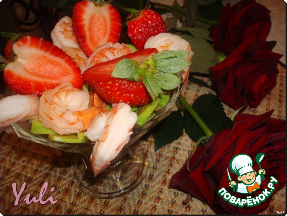 Романтический ужин на двоих, свечи, нежная клубника с креветками и авокадо.... Столь необычное сочетание рождает любовь. Мужчина у ваших ног... "Scarlett к 8 Марта".