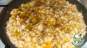Фарш тоже добавить к луку и к морковке, добавить специи, соль, перец по вкусу и тушить 15 минут, пока жидкость не уменьшится
