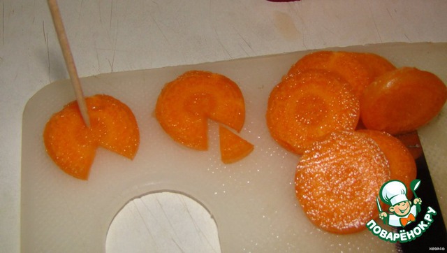 Морковку нарезаем на кружочки и вырезаем уголок...