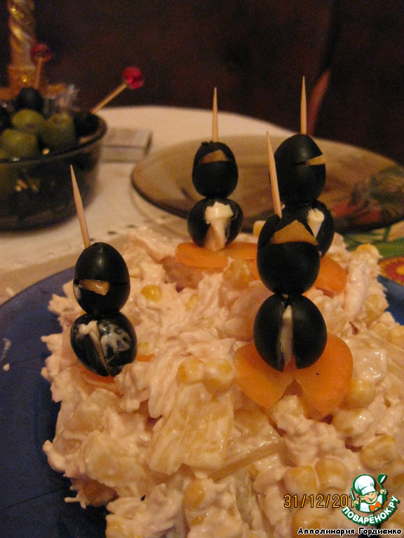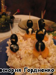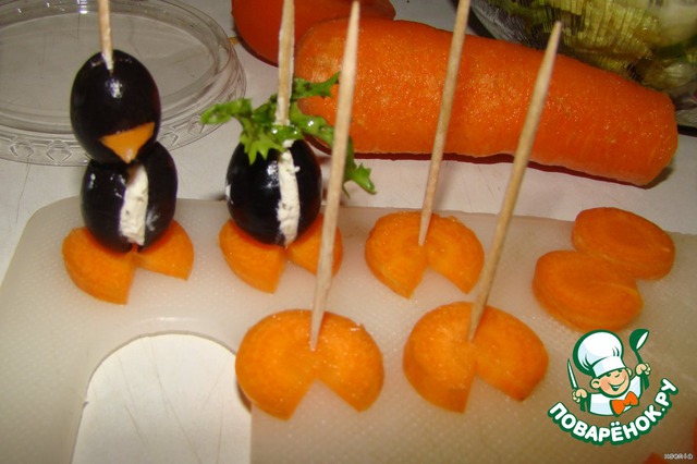Затем сверху целую маслину..и носик из уголка морковки))))В Принципе можно здесь ничего и не объяснять..и так все видно)))))Украшение классное..спасибо кулинару (Имени не знаю, а ник насколько я поняла 147258) за хорошую идею))