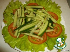 Режем кружочками помидор и соломкой огурец
