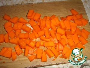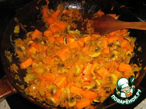 Режем тыкву на кубики и добавляем в сковородку, еще несколько минут и можно снимать с огня!