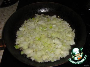 Теперь готовим зажарочку, лучок мелко режеми обжариваем на сковородке