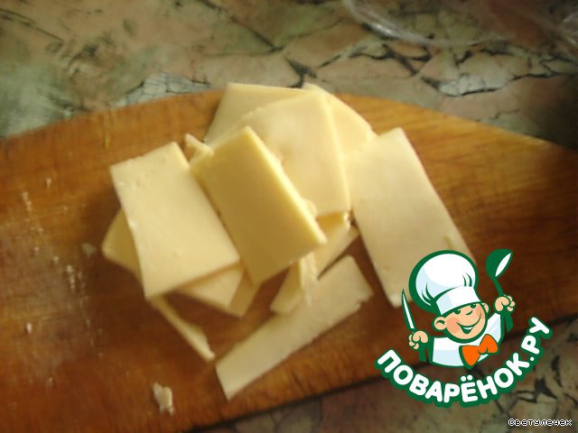кладём кусочек сыра, затем маслину и заворачиваем в рулетик,