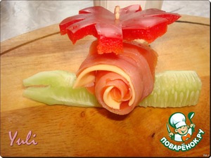 В качестве украшения можно также использовать цветной перец,нарезанный в виде цветочков.Для этого отрезаем нижнюю часть перца и ножом вырезаем лепесточки.