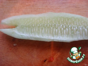 Свежий огурец разрезать вдоль на 2 части.Очистить от кожуры.Вырезать улитке усики. -
