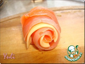 Из полосок форели и сыра делаем "домик" для улитки