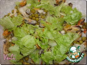 Добавить зеленый горошек и листья салата тоже измельченные(я их рву руками).