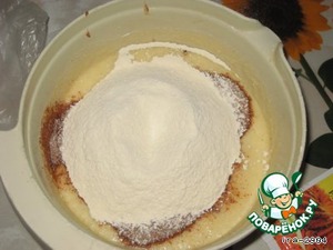 Далее добавляем муку, разрыхлитель и измельченныешарики.