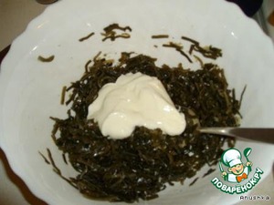 Морскую капусту откинуть на дуршлаг и дать стечь всей жидкости