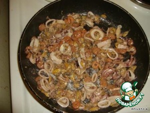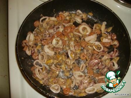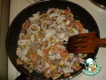Морской коктейль разморозить, промыть. Обжарить на сковородке с маслом до момента выпаривания жидкости и образования легкого золотистого цвета.