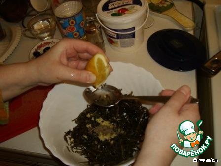 В морскую капусту выдавить чеснок, добавить перец и соль, выдавить примерно 1 ст. ложку лимонного сока и тщательно перемешать.