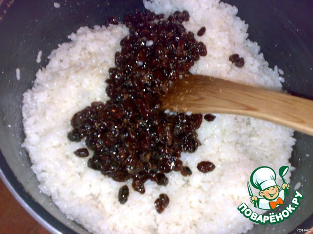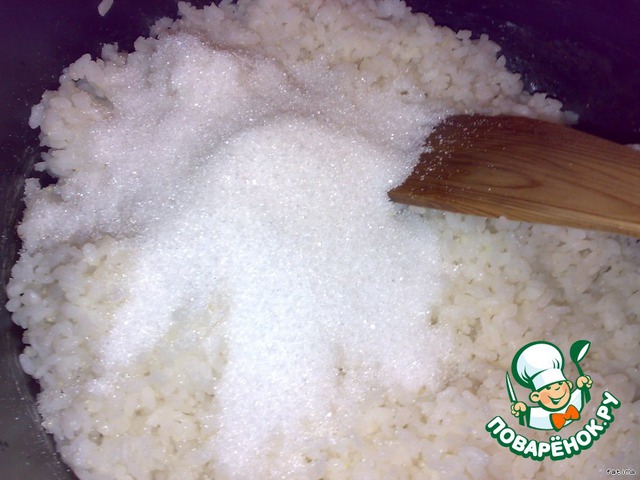 Тем временем рис уже готов, добавляем сахар в рис и хорошенечко перемешиваем