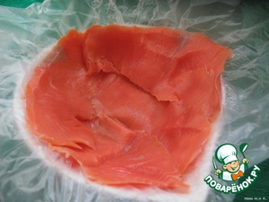 Взять 2 кокотницы или подходящие для этого мисочки с круглым дном, простелить дно пленкой, выстелить их ровно ломтиками лосося без пропусков внахлест, чтоб начинка не выпадала.