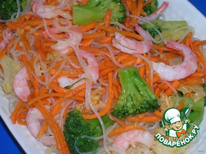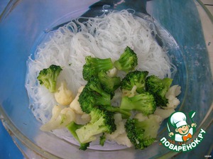 Отвариваем брокколи и цветную капусту около 1 минуты. Откидываем на дуршлаг, добавляем к рисовой лапше.