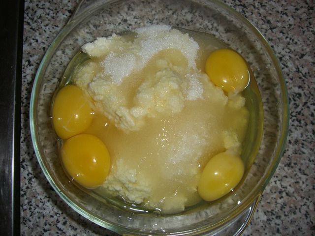 Готовим начинку: творог, сахар, яйца, ванилин.