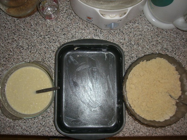 На низ высыпаем половину теста, затем в середину выливаем всю начинку, сверху засыпаем 2-ой половиной оставшегося теста