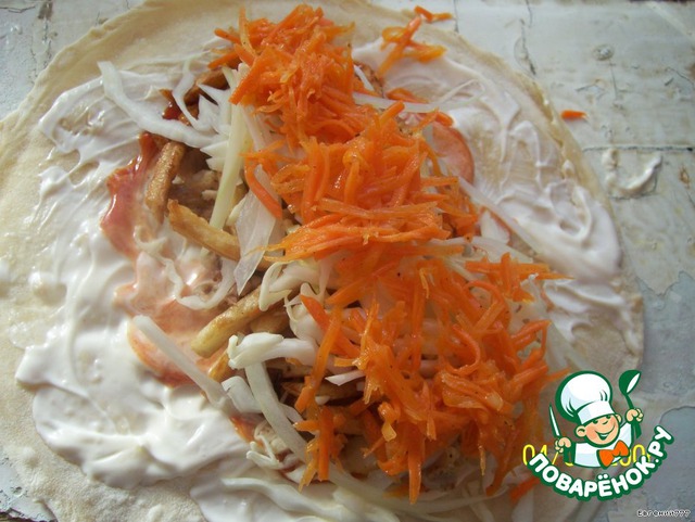 лук - и все это заворачиваем с трех сторон в лаваш, греем в духовке и...