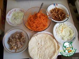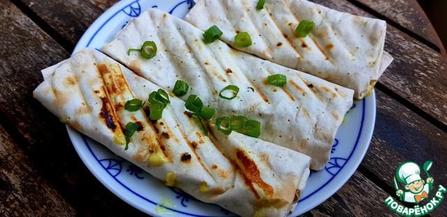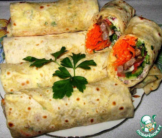 Раскладываем все на лаваше, заворачиваем и можно поставить на разогрев в микроволновку.