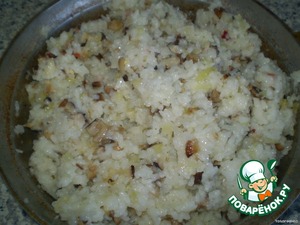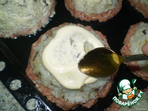Рис с грибами разделить на равные части по количеству мясных лепёшек, сформовать руками шарики, придавая слегка конусообразную форму, выложить на фарш.