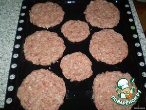 Противень смазать маслом. Из фарша сформовать лепёшки толщиной 1-1,5 см и выложить на противень.