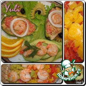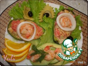 Второй плод авокадо используется для украшения: он также разрезается пополам, удаляется косточка и нарезается дольками.