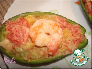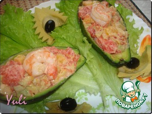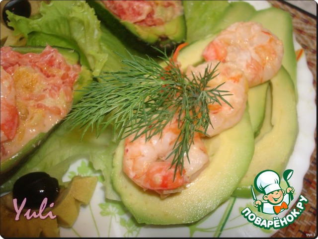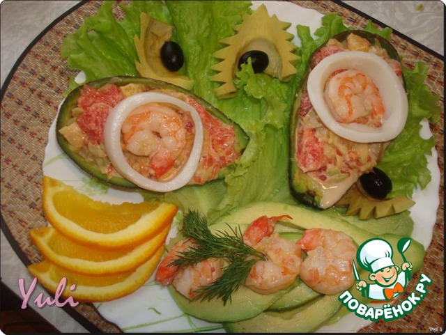 Второй плод авокадо используется для украшения: он также разрезается пополам, удаляется косточка и нарезается дольками.